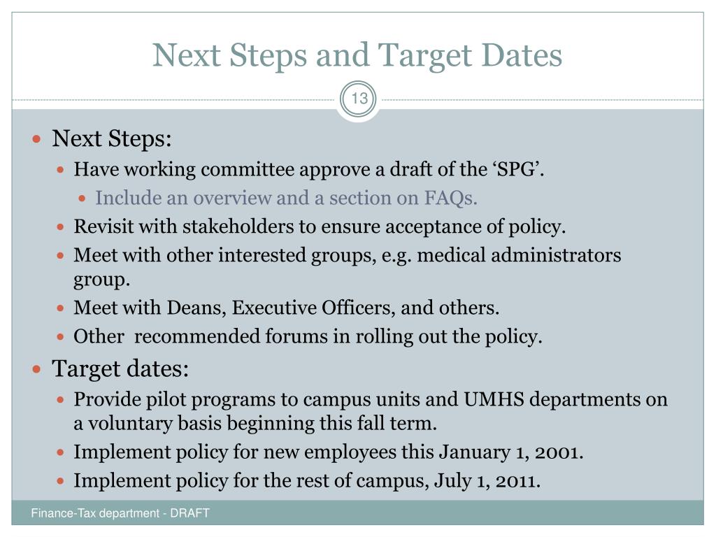 Next Steps and Target Dates • Next Steps: • Have working committee approve a draft of the ‘SPG’. • Include an overview and a section on FAQs. • Revisit with stakeholders to ensure acceptance of policy. • Meet with other interested groups, e.g. medical administrators group. • Meet with Deans, Executive Officers, and others. • Other recommended forums in rolling out the policy. • Target dates: • Provide pilot programs to campus units and UMHS departments on a voluntary basis beginning this fall term. • Implement policy for new employees this January 1, 2001. • Implement policy for the rest of campus, July 1, 2011. Finance-Tax department - DRAFT