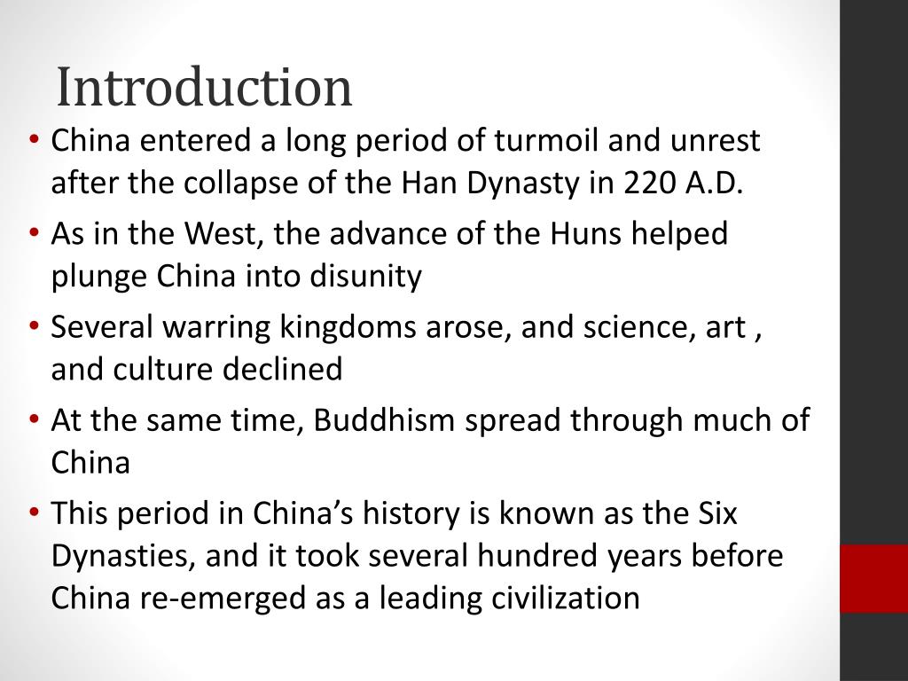 Introduction • China entered a long period of turmoil and unrest after the collapse of the Han Dynasty in 220 A.D. • As in the West, the advance of the Huns helped plunge China into disunity • Several warring kingdoms arose, and science, art , and culture declined • At the same time, Buddhism spread through much of China • This period in China’s history is known as the Six Dynasties, and it took several hundred years before China re-emerged as a leading civilization