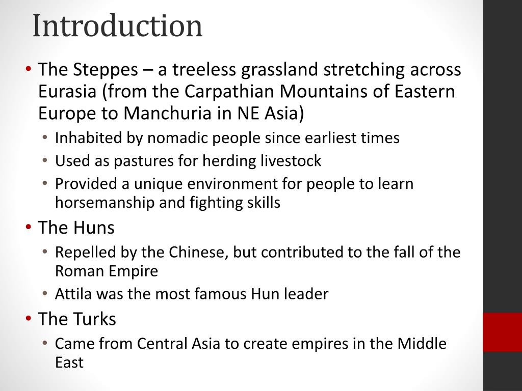 Introduction • The Steppes – a treeless grassland stretching across Eurasia (from the Carpathian Mountains of Eastern Europe to Manchuria in NE Asia) • Inhabited by nomadic people since earliest times • Used as pastures for herding livestock • Provided a unique environment for people to learn horsemanship and fighting skills • The Huns • Repelled by the Chinese, but contributed to the fall of the Roman Empire • Attila was the most famous Hun leader • The Turks • Came from Central Asia to create empires in the Middle East