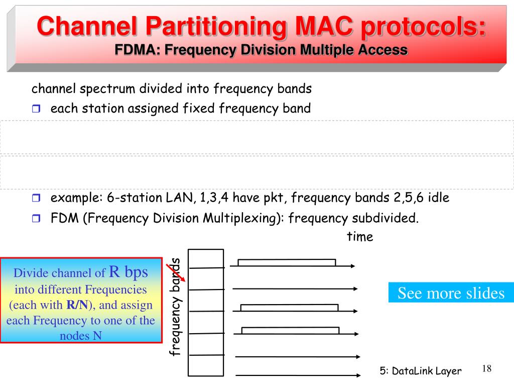 Channel Partitioning MAC protocols: FDMA: Frequency Division Multiple Access channel spectrum divided into frequency bands • each station assigned fixed frequency band • Drawback: • Unused transmission time in frequency bands go idle • Node is limited to a bandwidth of R/N, even when all the other nodes are idle at the time • example: 6-station LAN, 1,3,4 have pkt, frequency bands 2,5,6 idle • FDM (Frequency Division Multiplexing): frequency subdivided. time Divide channel of R bps into different Frequencies (each with R/N), and assign each Frequency to one of the nodes N See more slides frequency bands