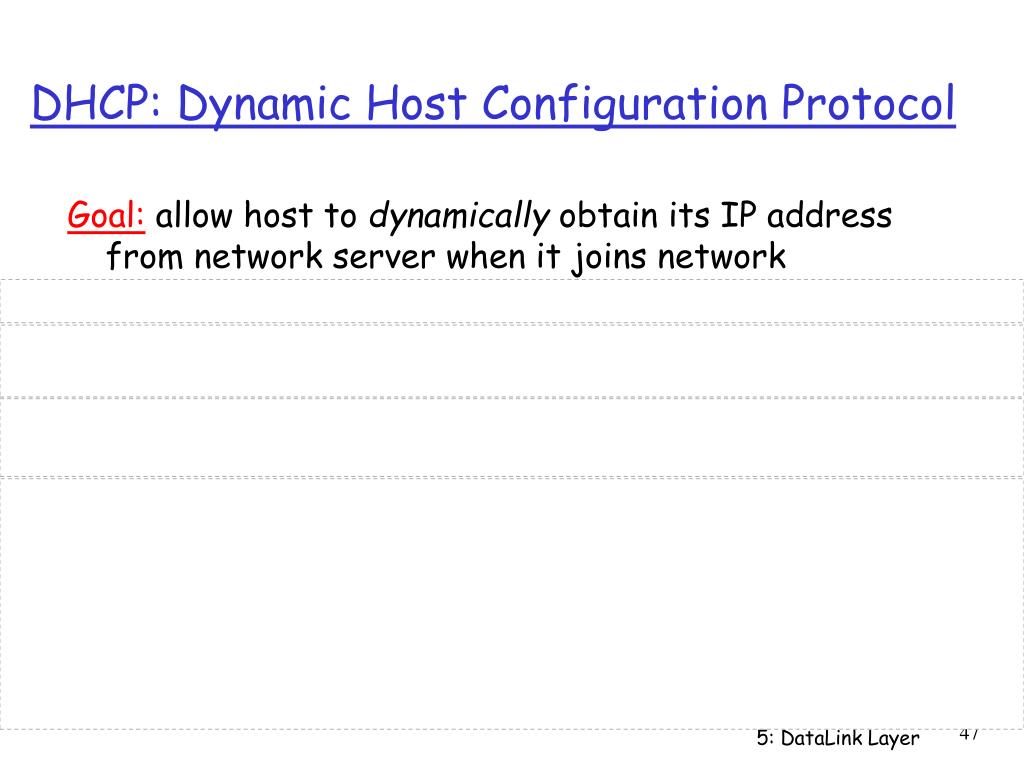 DHCP: Dynamic Host Configuration Protocol Goal: allow host to dynamically obtain its IP address from network server when it joins network Can renew its lease on address in use Allows reuse of addresses (only hold address while connected and “on” Support for mobile users who want to join network (more shortly) DHCP overview: • host broadcasts “DHCP discover” msg • DHCP server responds with “DHCP offer” msg • host requests IP address: “DHCP request” msg • DHCP server sends address: “DHCP ack” msg