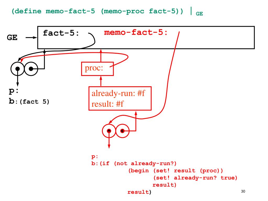 (define memo-fact-5 (memo-proc fact-5))| GE memo-fact-5: fact-5: GE proc: p: b:(fact 5) already-run: #f result: #f p: b:(if (not already-run?) (begin (set! result (proc)) (set! already-run? true) result) result)