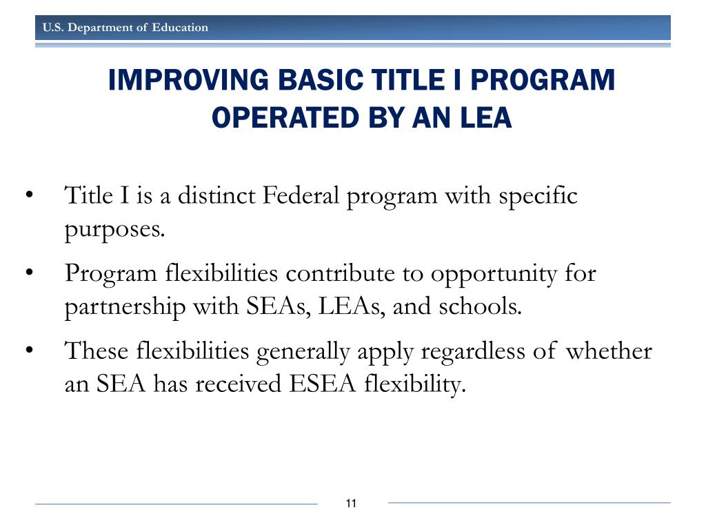 Improving Basic Title I Program Operated by An LEA • Title I is a distinct Federal program with specific purposes. • Program flexibilities contribute to opportunity for partnership with SEAs, LEAs, and schools. • These flexibilities generally apply regardless of whether an SEA has received ESEA flexibility.