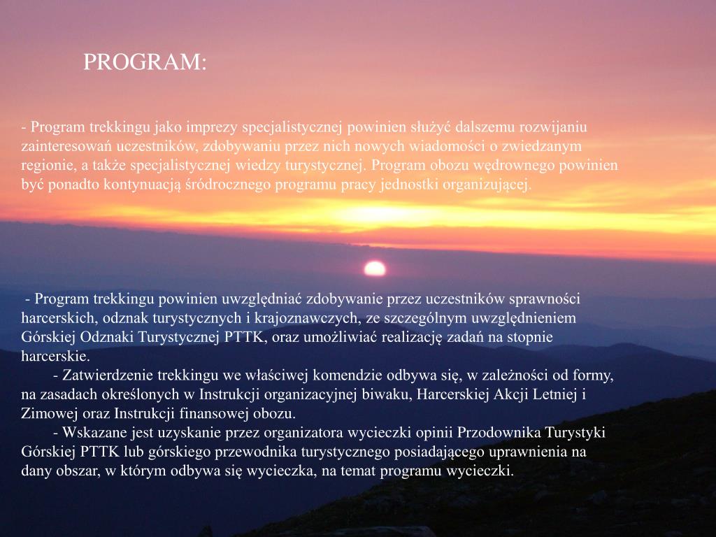 Program PROGRAM: - Program trekkingu jako imprezy specjalistycznej powinien służyć dalszemu rozwijaniu zainteresowań uczestników, zdobywaniu przez nich nowych wiadomości o zwiedzanym regionie, a także specjalistycznej wiedzy turystycznej. Program obozu wędrownego powinien być ponadto kontynuacją śródrocznego programu pracy jednostki organizującej. - Program trekkingu powinien uwzględniać zdobywanie przez uczestników sprawności harcerskich, odznak turystycznych i krajoznawczych, ze szczególnym uwzględnieniem Górskiej Odznaki Turystycznej PTTK, oraz umożliwiać realizację zadań na stopnie harcerskie. - Zatwierdzenie trekkingu we właściwej komendzie odbywa się, w zależności od formy, na zasadach określonych w Instrukcji organizacyjnej biwaku, Harcerskiej Akcji Letniej i Zimowej oraz Instrukcji finansowej obozu. - Wskazane jest uzyskanie przez organizatora wycieczki opinii Przodownika Turystyki Górskiej PTTK lub górskiego przewodnika turystycznego posiadającego uprawnienia na dany obszar, w którym odbywa się wycieczka, na temat programu wycieczki. - Program trekkingu jako imprezy specjalistycznej powinien służyć dalszemu rozwijaniu zainteresowań uczestników, zdobywaniu przez nich nowych wiadomości o zwiedzanym regionie, a także specjalistycznej wiedzy turystycznej. Program obozu wędrownego powinien być ponadto kontynuacją śródrocznego programu pracy jednostki organizującej. - Program trekkingu powinien uwzględniać zdobywanie przez uczestników sprawności harcerskich, odznak turystycznych i krajoznawczych, ze szczególnym uwzględnieniem Górskiej Odznaki Turystycznej PTTK, oraz umożliwiać realizację zadań na stopnie harcerskie. - Zatwierdzenie trekkingu we właściwej komendzie odbywa się, w zależności od formy, na zasadach określonych w Instrukcji organizacyjnej biwaku, Harcerskiej Akcji Letniej i Zimowej oraz Instrukcji finansowej obozu. - Wskazane jest uzyskanie przez organizatora wycieczki opinii Przodownika Turystyki Górskiej PTTK lub górskiego przewodnika turystycznego posiadającego uprawnienia na dany obszar, w którym odbywa się wycieczka, na temat programu wycieczki.