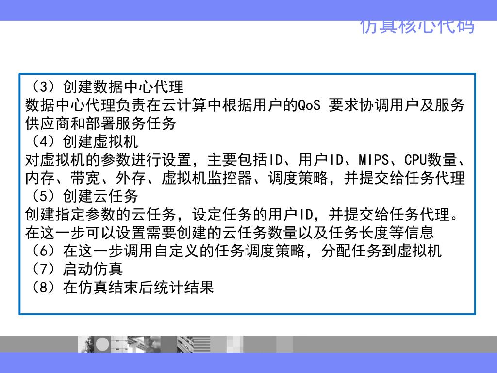仿真核心代码 (3)创建数据中心代理 数据中心代理负责在云计算中根据用户的QoS 要求协调用户及服务供应商和部署服务任务 (4)创建虚拟机 对虚拟机的参数进行设置,主要包括ID、用户ID、MIPS、CPU数量、内存、带宽、外存、虚拟机监控器、调度策略,并提交给任务代理 (5)创建云任务 创建指定参数的云任务,设定任务的用户ID,并提交给任务代理。在这一步可以设置需要创建的云任务数量以及任务长度等信息 (6)在这一步调用自定义的任务调度策略,分配任务到虚拟机 (7)启动仿真 (8)在仿真结束后统计结果