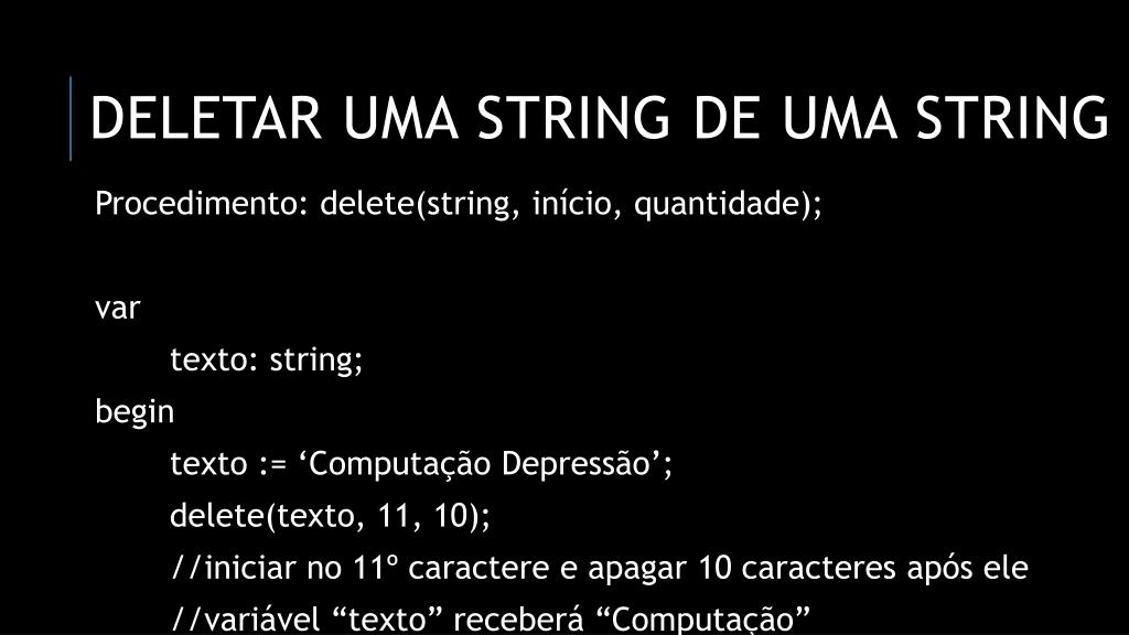 Deletar uma string de uma string • Procedimento: delete(string, início, quantidade); • var • texto: string; • begin • texto := ‘Computação Depressão’; • delete(texto, 11, 10); • //iniciar no 11º caractere e apagar 10 caracteres após ele • //variável “texto” receberá “Computação”