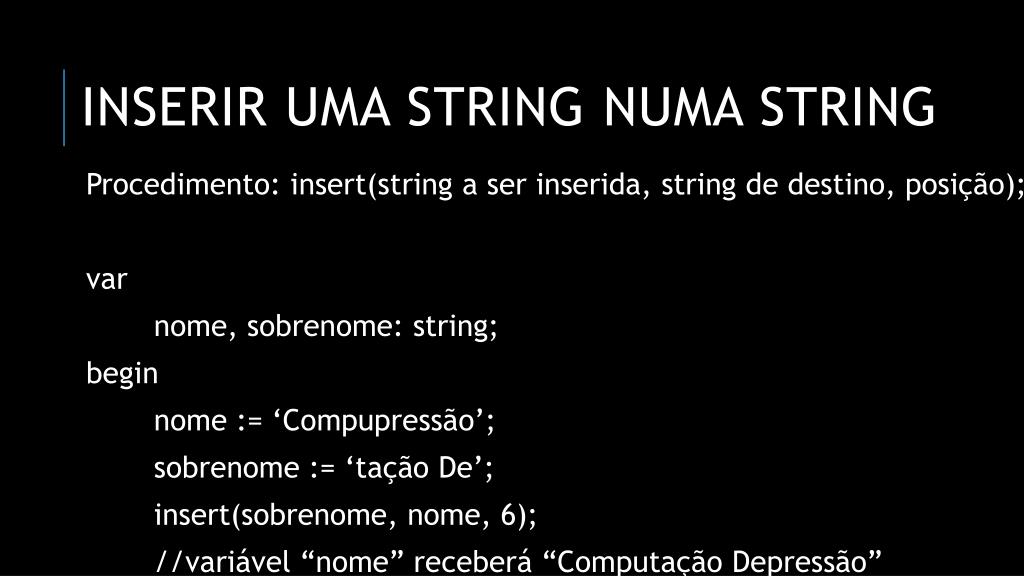 Inserir uma string numa string • Procedimento: insert(string a ser inserida, string de destino, posição); • var • nome, sobrenome: string; • begin • nome := ‘Compupressão’; • sobrenome := ‘tação De’; • insert(sobrenome, nome, 6); • //variável “nome” receberá “Computação Depressão”