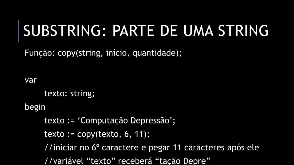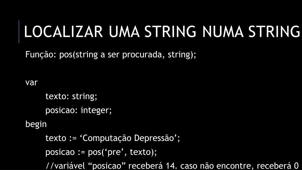 localizar uma string numa string • Função: pos(string a ser procurada, string); • var • texto: string; • posicao: integer; • begin • texto := ‘Computação Depressão’; • posicao := pos(‘pre’, texto); • //variável “posicao” receberá 14. caso não encontre, receberá 0