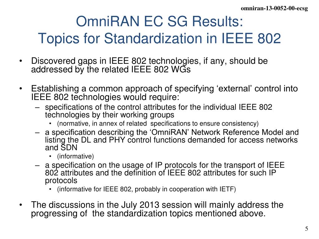 OmniRAN EC SG Results:Topics for Standardization in IEEE 802 • Discovered gaps in IEEE 802 technologies, if any, should be addressed by the related IEEE 802 WGs • Establishing a common approach of specifying ‘external’ control into IEEE 802 technologies would require: • specifications of the control attributes for the individual IEEE 802 technologies by their working groups • (normative, in annex of related specifications to ensure consistency) • a specification describing the ‘OmniRAN’ Network Reference Model and listing the DL and PHY control functions demanded for access networks and SDN • (informative) • a specification on the usage of IP protocols for the transport of IEEE 802 attributes and the definition of IEEE 802 attributes for such IP protocols • (informative for IEEE 802, probably in cooperation with IETF) • The discussions in the July 2013 session will mainly address the progressing of the standardization topics mentioned above.