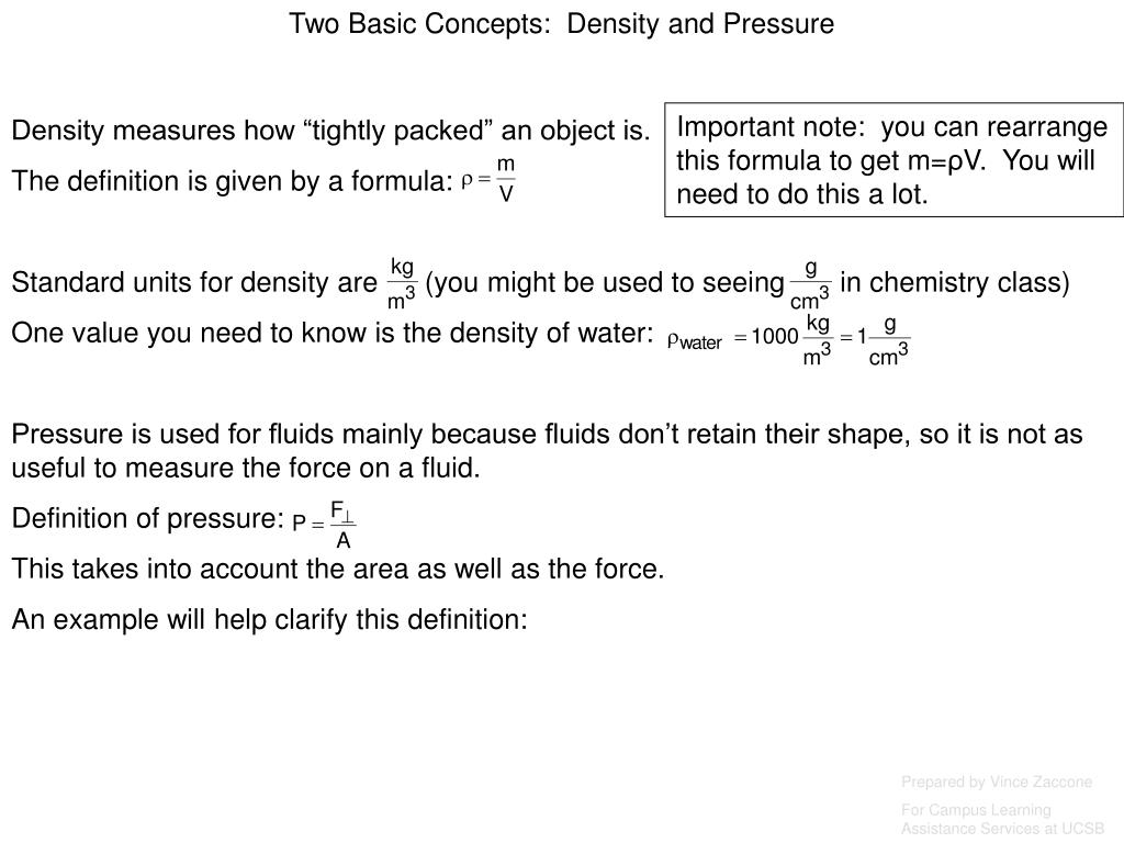 Two Basic Concepts: Density and Pressure Density measures how “tightly packed” an object is. The definition is given by a formula: Important note: you can rearrange this formula to get m=ρV. You will need to do this a lot. Prepared by Vince Zaccone For Campus Learning Assistance Services at UCSB