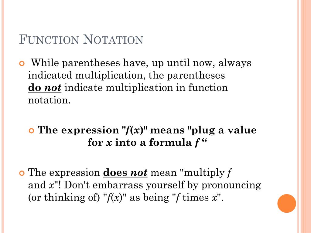 Function Notation • While parentheses have, up until now, always indicated multiplication, the parentheses do not indicate multiplication in function notation. • The expression "f(x)" means "plug a value for x into a formula f “ • The expression does not mean "multiply f and x"! Don't embarrass yourself by pronouncing (or thinking of) "f(x)" as being "f times x".