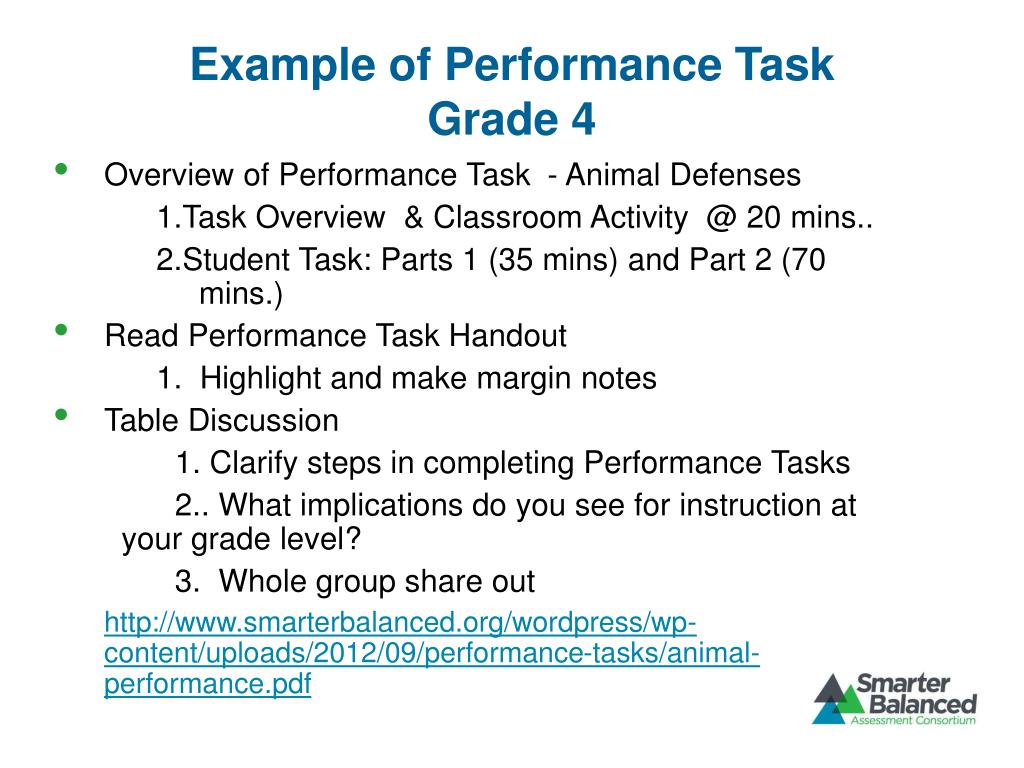 Example of Performance TaskGrade 4 • Overview of Performance Task - Animal Defenses 1.Task Overview & Classroom Activity @ 20 mins.. 2.Student Task: Parts 1 (35 mins) and Part 2 (70 mins.) • Read Performance Task Handout 1. Highlight and make margin notes • Table Discussion 1. Clarify steps in completing Performance Tasks 2.. What implications do you see for instruction at your grade level? 3. Whole group share out http://www.smarterbalanced.org/wordpress/wp-content/uploads/2012/09/performance-tasks/animal-performance.pdf