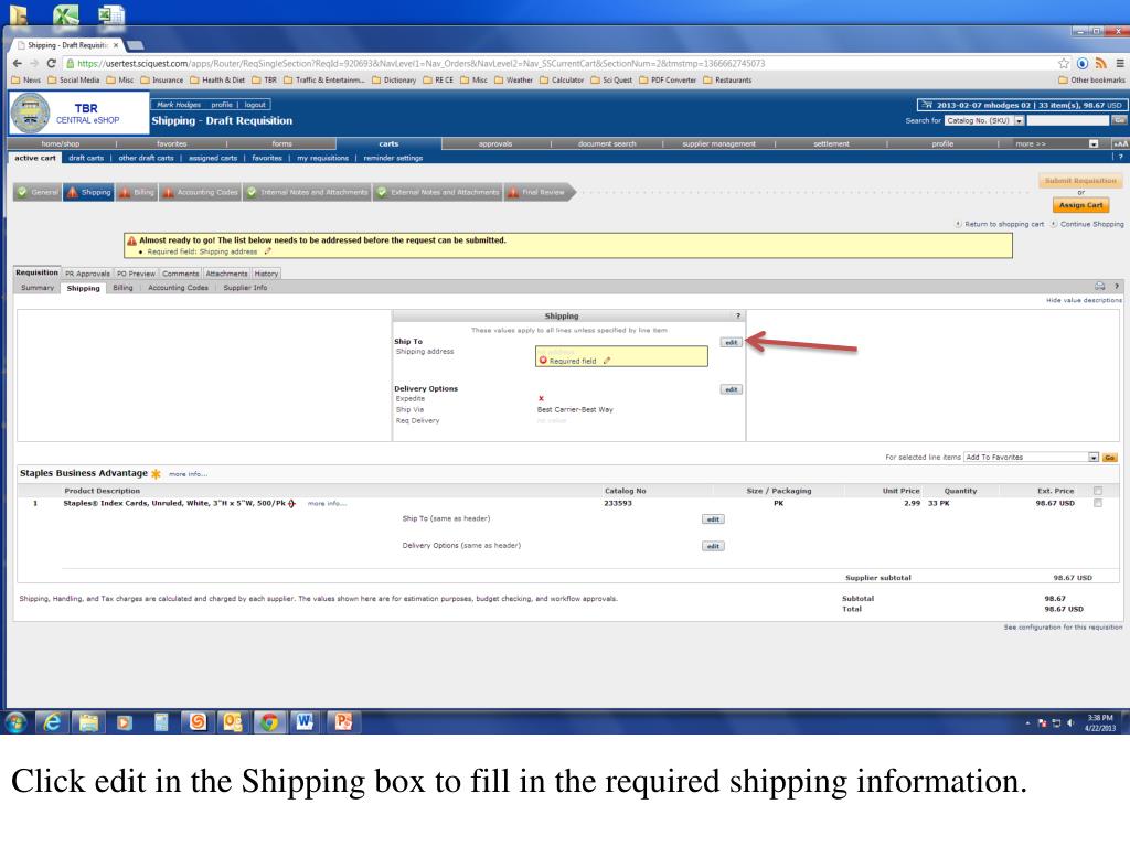 Please note that if the Ship To and Bill To addresses have been set, as covered on slides 9 – 13 of the of the User Registration and Login Training Presentation, it will not be necessary to fill in the Shipping and Billing information.