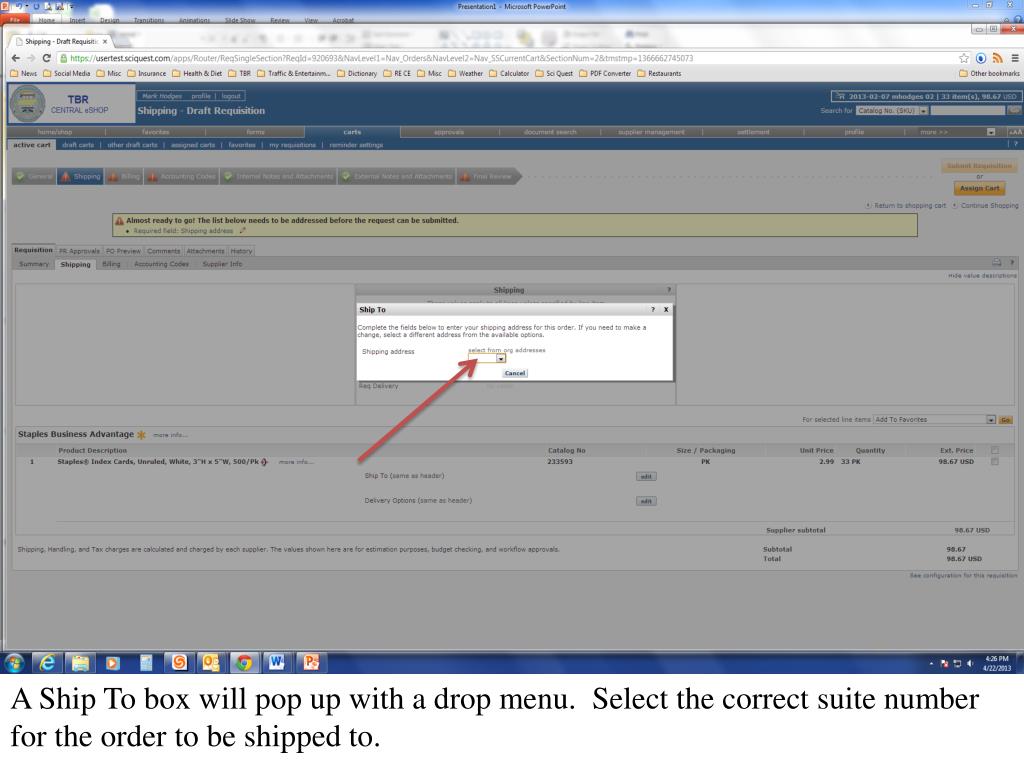 A Ship To box will pop up with a drop menu. Select the correct suite number for the order to be shipped to.