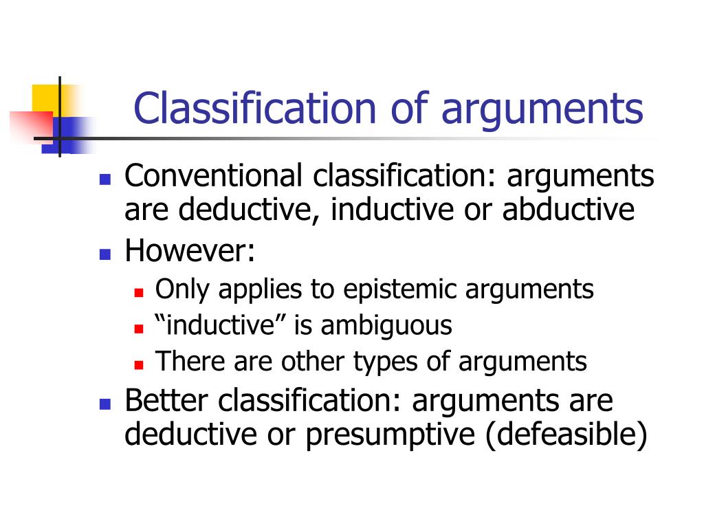 Classification of arguments • Conventional classification: arguments are deductive, inductive or abductive • However: • Only applies to epistemic arguments • “inductive” is ambiguous • There are other types of arguments • Better classification: arguments are deductive or presumptive (defeasible)