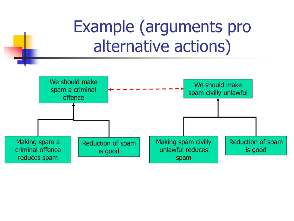Example (arguments pro alternative actions) We should make spam a criminal offence We should make spam civilly unlawful Making spam a criminal offence reduces spam Making spam civilly unlawful reduces spam Reduction of spam is good Reduction of spam is good