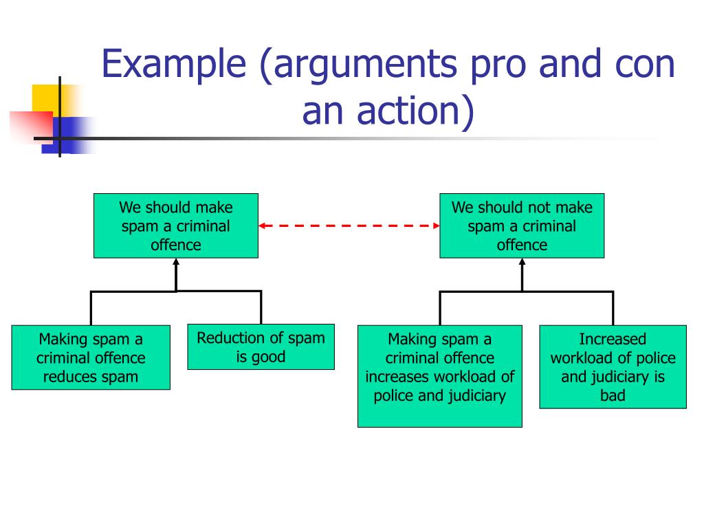 Example (arguments pro and con an action) We should make spam a criminal offence We should not make spam a criminal offence Reduction of spam is good Making spam a criminal offence reduces spam Making spam a criminal offence increases workload of police and judiciary Increased workload of police and judiciary is bad