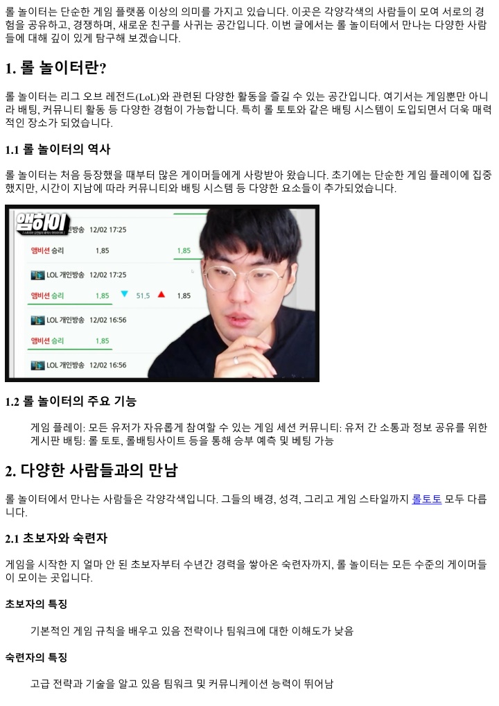 롤놀이터는단순한게임플랫폼이상의의미를가지고있습니다. 이곳은각양각색의사람들이모여서로의경 험을공유하고, 경쟁하며, 새로운친구를사귀는공간입니다. 이번글에서는롤놀이터에서만나는다양한사람 들에대해깊이있게탐구해보겠습니다. 1. 롤놀이터란? 롤놀이터는리그오브레전드(LoL)와관련된다양한활동을즐길수있는공간입니다. 여기서는게임뿐만아니 라배팅, 커뮤니티활동등다양한경험이가능합니다. 특히롤토토와같은배팅시스템이도입되면서더욱매력 적인장소가되었습니다. 1.1 롤놀이터의역사 롤놀이터는처음등장했을때부터많은게이머들에게사랑받아왔습니다. 초기에는단순한게임플레이에집중 했지만, 시간이지남에따라커뮤니티와배팅시스템등다양한요소들이추가되었습니다. 1.2 롤놀이터의주요기능 게임플레이: 모든유저가자유롭게참여할수있는게임세션커뮤니티: 유저간소통과정보공유를위한 게시판배팅: 롤토토, 롤배팅사이트등을통해승부예측및베팅가능 2. 다양한사람들과의만남 롤놀이터에서만나는사람들은각양각색입니다. 그들의배경, 성격, 그리고게임스타일까지롤토토모두다릅 니다. 2.1 초보자와숙련자 게임을시작한지얼마안된초보자부터수년간경력을쌓아온숙련자까지, 롤놀이터는모든수준의게이머들 이모이는곳입니다. 초보자의특징 기본적인게임규칙을배우고있음전략이나팀워크에대한이해도가낮음 숙련자의특징 고급전략과기술을알고있음팀워크및커뮤니케이션능력이뛰어남