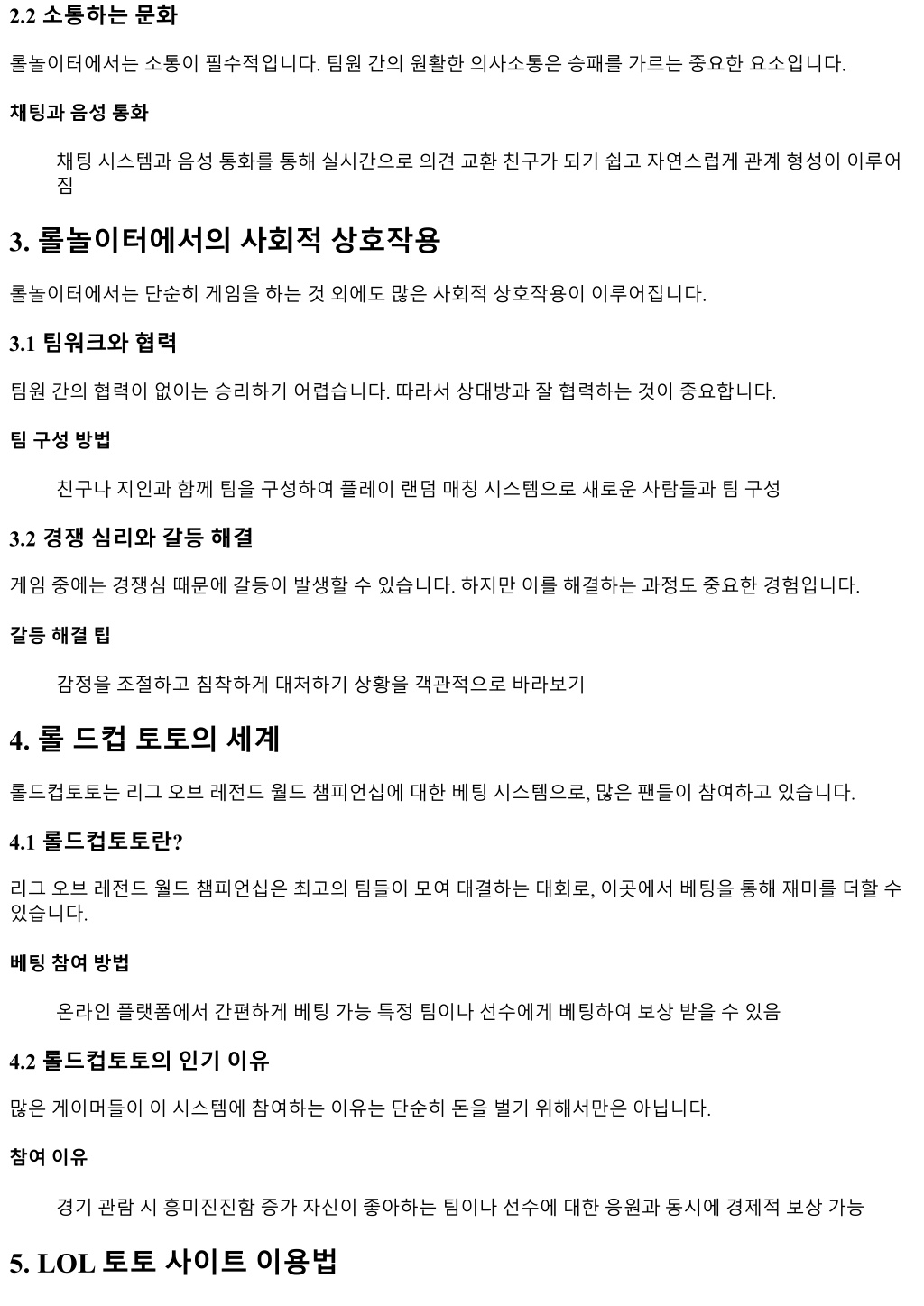 2.2 소통하는문화 롤놀이터에서는소통이필수적입니다. 팀원간의원활한의사소통은승패를가르는중요한요소입니다. 채팅과음성통화 채팅시스템과음성통화를통해실시간으로의견교환친구가되기쉽고자연스럽게관계형성이이루어 짐 3. 롤놀이터에서의사회적상호작용 롤놀이터에서는단순히게임을하는것외에도많은사회적상호작용이이루어집니다. 3.1 팀워크와협력 팀원간의협력이없이는승리하기어렵습니다. 따라서상대방과잘협력하는것이중요합니다. 팀구성방법 친구나지인과함께팀을구성하여플레이랜덤매칭시스템으로새로운사람들과팀구성 3.2 경쟁심리와갈등해결 게임중에는경쟁심때문에갈등이발생할수있습니다. 하지만이를해결하는과정도중요한경험입니다. 갈등해결팁 감정을조절하고침착하게대처하기상황을객관적으로바라보기 4. 롤드컵토토의세계 롤드컵토토는리그오브레전드월드챔피언십에대한베팅시스템으로, 많은팬들이참여하고있습니다. 4.1 롤드컵토토란? 리그오브레전드월드챔피언십은최고의팀들이모여대결하는대회로, 이곳에서베팅을통해재미를더할수 있습니다. 베팅참여방법 온라인플랫폼에서간편하게베팅가능특정팀이나선수에게베팅하여보상받을수있음 4.2 롤드컵토토의인기이유 많은게이머들이이시스템에참여하는이유는단순히돈을벌기위해서만은아닙니다. 참여이유 경기관람시흥미진진함증가자신이좋아하는팀이나선수에대한응원과동시에경제적보상가능 5. LOL 토토사이트이용법