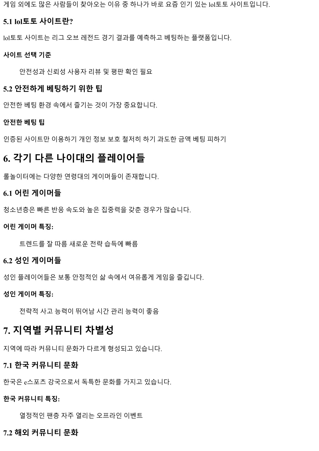 게임외에도많은사람들이찾아오는이유중하나가바로요즘인기있는 lol토토사이트입니다. 5.1 lol토토사이트란? lol토토사이트는리그오브레전드경기결과를예측하고베팅하는플랫폼입니다. 사이트선택기준 안전성과신뢰성사용자리뷰및평판확인필요 5.2 안전하게베팅하기위한팁 안전한베팅환경속에서즐기는것이가장중요합니다. 안전한베팅팁 인증된사이트만이용하기개인정보보호철저히하기과도한금액베팅피하기 6. 각기다른나이대의플레이어들 롤놀이터에는다양한연령대의게이머들이존재합니다. 6.1 어린게이머들 청소년층은빠른반응속도와높은집중력을갖춘경우가많습니다. 어린게이머특징: 트렌드를잘따름새로운전략습득에빠름 6.2 성인게이머들 성인플레이어들은보통안정적인삶속에서여유롭게게임을즐깁니다. 성인게이머특징: 전략적사고능력이뛰어남시간관리능력이좋음 7. 지역별커뮤니티차별성 지역에따라커뮤니티문화가다르게형성되고있습니다. 7.1 한국커뮤니티문화 한국은 e스포츠강국으로서독특한문화를가지고있습니다. 한국커뮤니티특징: 열정적인팬층자주열리는오프라인이벤트 7.2 해외커뮤니티문화