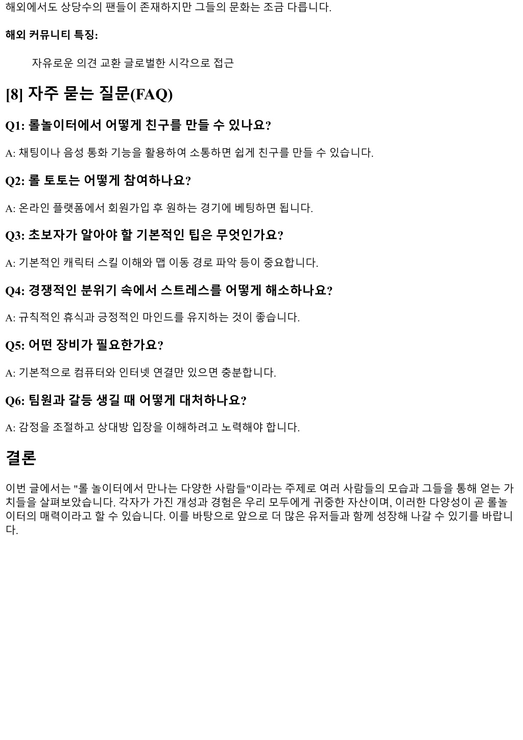 해외에서도상당수의팬들이존재하지만그들의문화는조금다릅니다.해외에서도상당수의팬들이존재하지만그들의문화는조금다릅니다. 해외커뮤니티특징: 자유로운의견교환글로벌한시각으로접근 [8] 자주묻는질문(FAQ) Q1: 롤놀이터에서어떻게친구를만들수있나요? A: 채팅이나음성통화기능을활용하여소통하면쉽게친구를만들수있습니다. Q2: 롤토토는어떻게참여하나요? A: 온라인플랫폼에서회원가입후원하는경기에베팅하면됩니다. Q3: 초보자가알아야할기본적인팁은무엇인가요? A: 기본적인캐릭터스킬이해와맵이동경로파악등이중요합니다. Q4: 경쟁적인분위기속에서스트레스를어떻게해소하나요? A: 규칙적인휴식과긍정적인마인드를유지하는것이좋습니다. Q5: 어떤장비가필요한가요? A: 기본적으로컴퓨터와인터넷연결만있으면충분합니다. Q6: 팀원과갈등생길때어떻게대처하나요? A: 감정을조절하고상대방입장을이해하려고노력해야합니다. 결론 이번글에서는 "롤놀이터에서만나는다양한사람들"이라는주제로여러사람들의모습과그들을통해얻는가 치들을살펴보았습니다. 각자가가진개성과경험은우리모두에게귀중한자산이며, 이러한다양성이곧롤놀 이터의매력이라고할수있습니다. 이를바탕으로앞으로더많은유저들과함께성장해나갈수있기를바랍니 다.