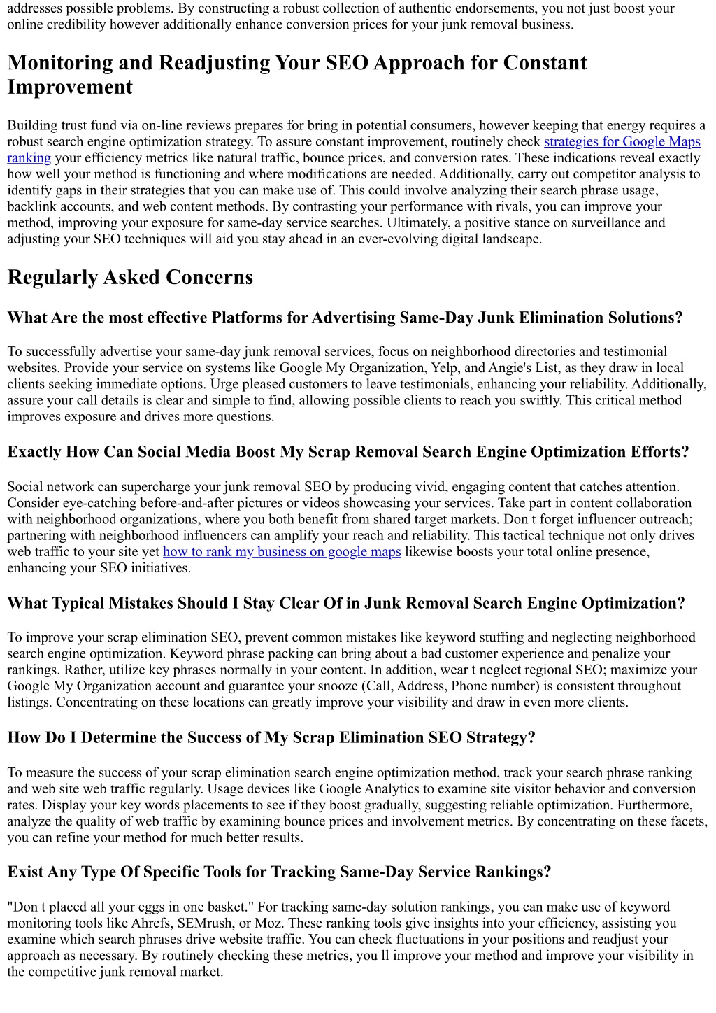 addresses possible problems. By constructing a robust collection of authentic endorsements, you not just boost your online credibility however additionally enhance conversion prices for your junk removal business. Monitoring and Readjusting Your SEO Approach for Constant Improvement Building trust fund via on-line reviews prepares for bring in potential consumers, however keeping that energy requires a robust search engine optimization strategy. To assure constant improvement, routinely check strategies for Google Maps ranking your efficiency metrics like natural traffic, bounce prices, and conversion rates. These indications reveal exactly how well your method is functioning and where modifications are needed. Additionally, carry out competitor analysis to identify gaps in their strategies that you can make use of. This could involve analyzing their search phrase usage, backlink accounts, and web content methods. By contrasting your performance with rivals, you can improve your method, improving your exposure for same-day service searches. Ultimately, a positive stance on surveillance and adjusting your SEO techniques will aid you stay ahead in an ever-evolving digital landscape. Regularly Asked Concerns What Are the most effective Platforms for Advertising Same-Day Junk Elimination Solutions? To successfully advertise your same-day junk removal services, focus on neighborhood directories and testimonial websites. Provide your service on systems like Google My Organization, Yelp, and Angie's List, as they draw in local clients seeking immediate options. Urge pleased customers to leave testimonials, enhancing your reliability. Additionally, assure your call details is clear and simple to find, allowing possible clients to reach you swiftly. This critical method improves exposure and drives more questions. Exactly How Can Social Media Boost My Scrap Removal Search Engine Optimization Efforts? Social network can supercharge your junk removal SEO by producing vivid, engaging content that catches attention. Consider eye-catching before-and-after pictures or videos showcasing your services. Take part in content collaboration with neighborhood organizations, where you both benefit from shared target markets. Don t forget influencer outreach; partnering with neighborhood influencers can amplify your reach and reliability. This tactical technique not only drives web traffic to your site yet how to rank my business on google maps likewise boosts your total online presence, enhancing your SEO initiatives. What Typical Mistakes Should I Stay Clear Of in Junk Removal Search Engine Optimization? To improve your scrap elimination SEO, prevent common mistakes like keyword stuffing and neglecting neighborhood search engine optimization. Keyword phrase packing can bring about a bad customer experience and penalize your rankings. Rather, utilize key phrases normally in your content. In addition, wear t neglect regional SEO; maximize your Google My Organization account and guarantee your snooze (Call, Address, Phone number) is consistent throughout listings. Concentrating on these locations can greatly improve your visibility and draw in even more clients. How Do I Determine the Success of My Scrap Elimination SEO Strategy? To measure the success of your scrap elimination search engine optimization method, track your search phrase ranking and web site web traffic regularly. Usage devices like Google Analytics to examine site visitor behavior and conversion rates. Display your key words placements to see if they boost gradually, suggesting reliable optimization. Furthermore, analyze the quality of web traffic by examining bounce prices and involvement metrics. By concentrating on these facets, you can refine your method for much better results. Exist Any Type Of Specific Tools for Tracking Same-Day Service Rankings? "Don t placed all your eggs in one basket." For tracking same-day solution rankings, you can make use of keyword monitoring tools like Ahrefs, SEMrush, or Moz. These ranking tools give insights into your efficiency, assisting you examine which search phrases drive website traffic. You can check fluctuations in your positions and readjust your approach as necessary. By routinely checking these metrics, you ll improve your method and improve your visibility in the competitive junk removal market.