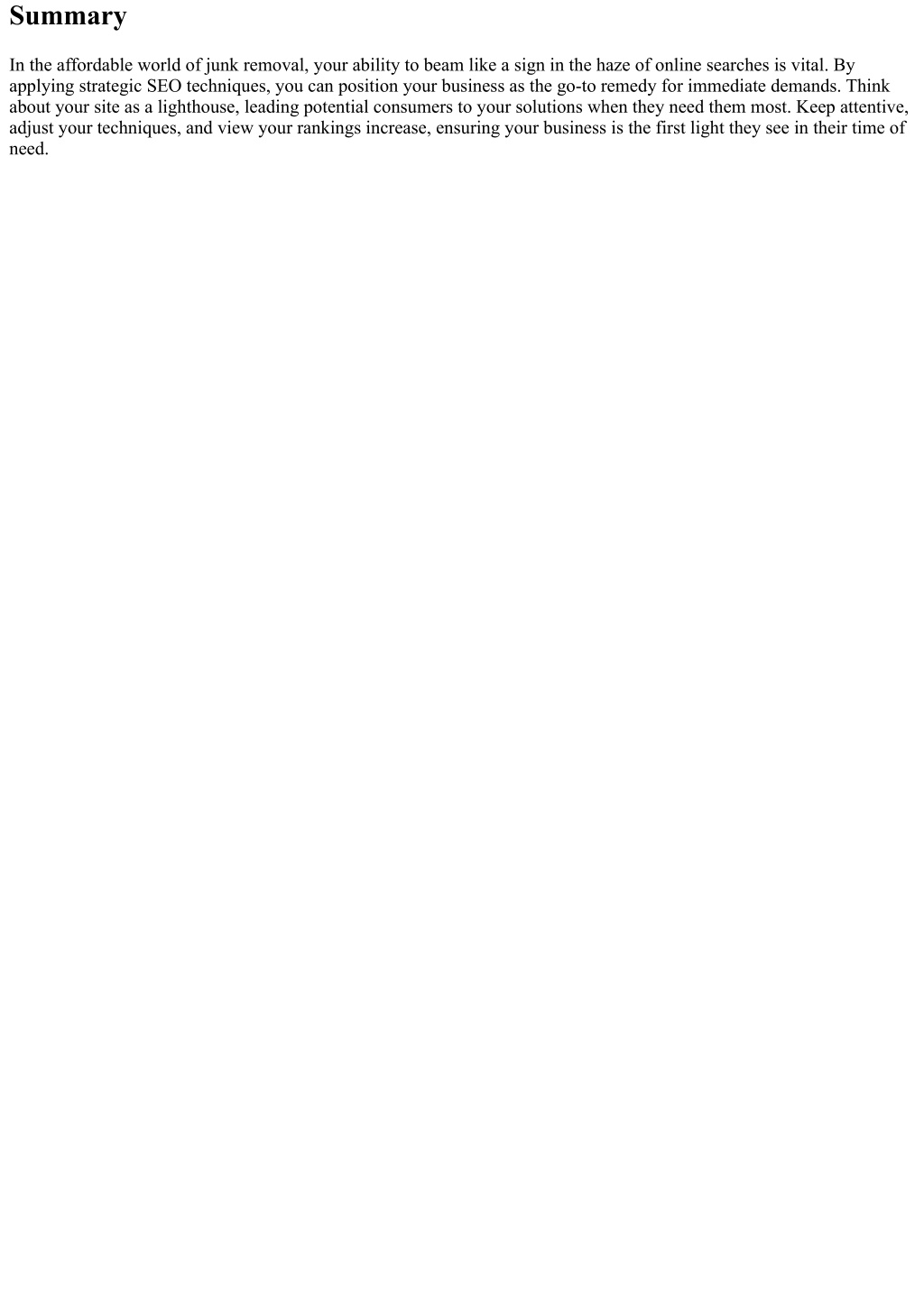 Summary In the affordable world of junk removal, your ability to beam like a sign in the haze of online searches is vital. By applying strategic SEO techniques, you can position your business as the go-to remedy for immediate demands. Think about your site as a lighthouse, leading potential consumers to your solutions when they need them most. Keep attentive, adjust your techniques, and view your rankings increase, ensuring your business is the first light they see in their time of need.