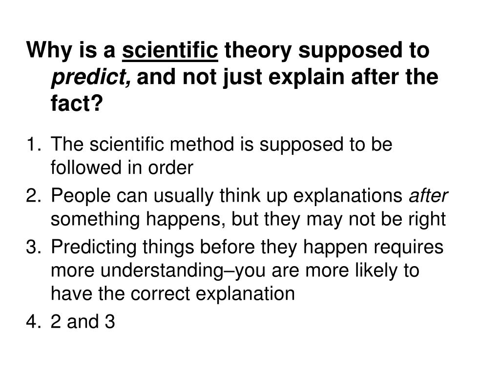 Why is a scientific theory supposed to predict, and not just explain after the fact? • The scientific method is supposed to be followed in order • People can usually think up explanations after something happens, but they may not be right • Predicting things before they happen requires more understanding–you are more likely to have the correct explanation • 2 and 3