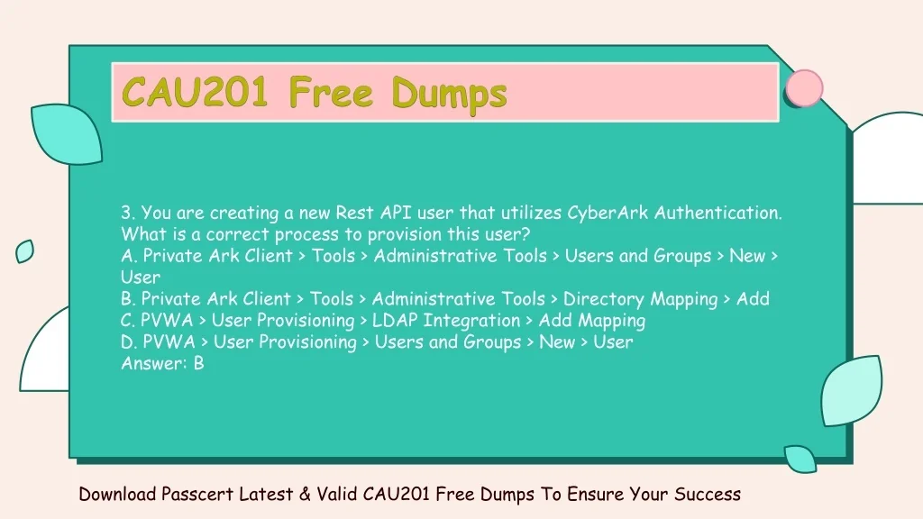 3. You are creating a new Rest API user that utilizes CyberArk Authentication. What is a correct process to provision this user? A. Private Ark Client > Tools > Administrative Tools > Users and Groups > New > User B. Private Ark Client > Tools > Administrative Tools > Directory Mapping > Add C. PVWA > User Provisioning > LDAP Integration > Add Mapping D. PVWA > User Provisioning > Users and Groups > New > User Answer: B Download Passcert Latest & Valid CAU201 Free Dumps To Ensure Your Success