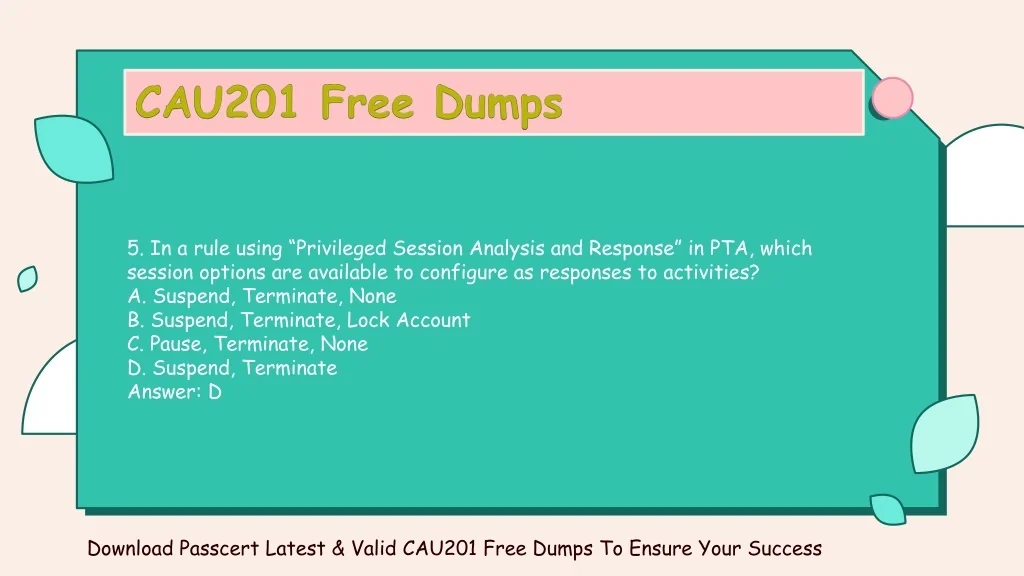 5. In a rule using “Privileged Session Analysis and Response” in PTA, which session options are available to configure as responses to activities? A. Suspend, Terminate, None B. Suspend, Terminate, Lock Account C. Pause, Terminate, None D. Suspend, Terminate Answer: D Download Passcert Latest & Valid CAU201 Free Dumps To Ensure Your Success