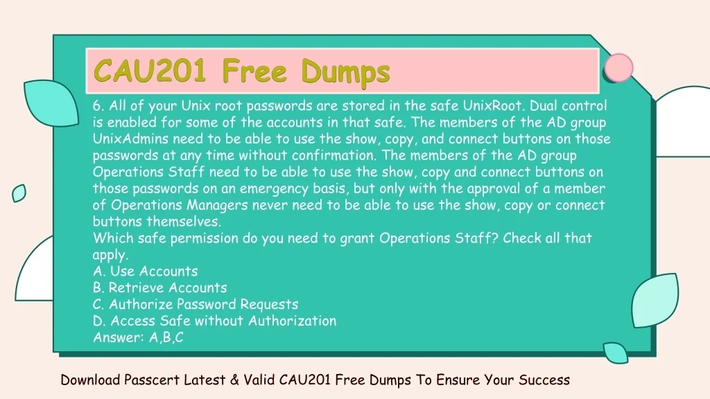 6. All of your Unix root passwords are stored in the safe UnixRoot. Dual control is enabled for some of the accounts in that safe. The members of the AD group UnixAdmins need to be able to use the show, copy, and connect buttons on those passwords at any time without confirmation. The members of the AD group Operations Staff need to be able to use the show, copy and connect buttons on those passwords on an emergency basis, but only with the approval of a member of Operations Managers never need to be able to use the show, copy or connect buttons themselves. Which safe permission do you need to grant Operations Staff? Check all that apply. A. Use Accounts B. Retrieve Accounts C. Authorize Password Requests D. Access Safe without Authorization Answer: A,B,C Download Passcert Latest & Valid CAU201 Free Dumps To Ensure Your Success