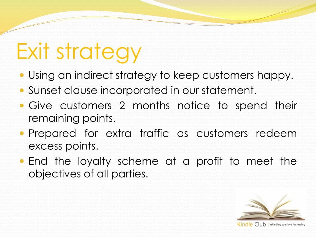 Exit strategy • Using an indirect strategy to keep customers happy. • Sunset clause incorporated in our statement. • Give customers 2 months notice to spend their remaining points. • Prepared for extra traffic as customers redeem excess points. • End the loyalty scheme at a profit to meet the objectives of all parties.