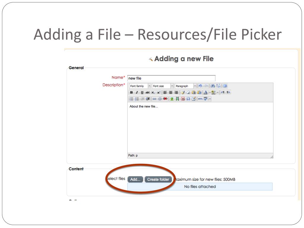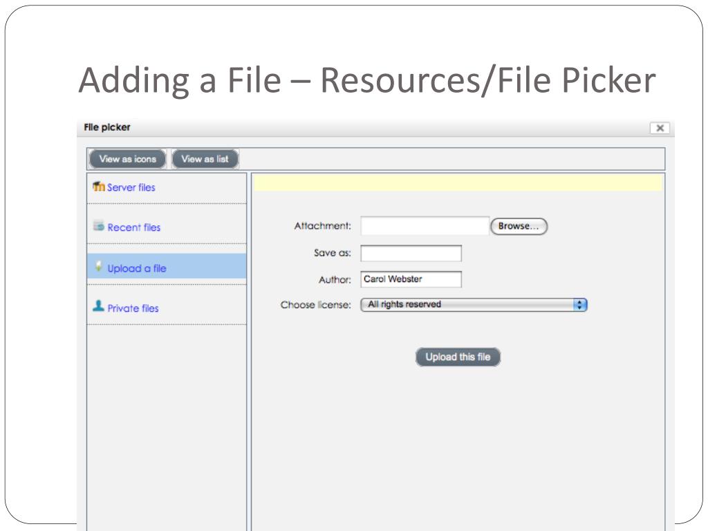 Editing a course • Icons – Each Week/Topic and Folder View Format 1 2 3 4 5 • Folder View Only - Add Topic Add Resource / Add Block / Edit Layout /Topic Settings • Edit • Visibility • Highlight Topic/Week/Folder as current • The one icon hides all other sections of the course, showing only this one.
