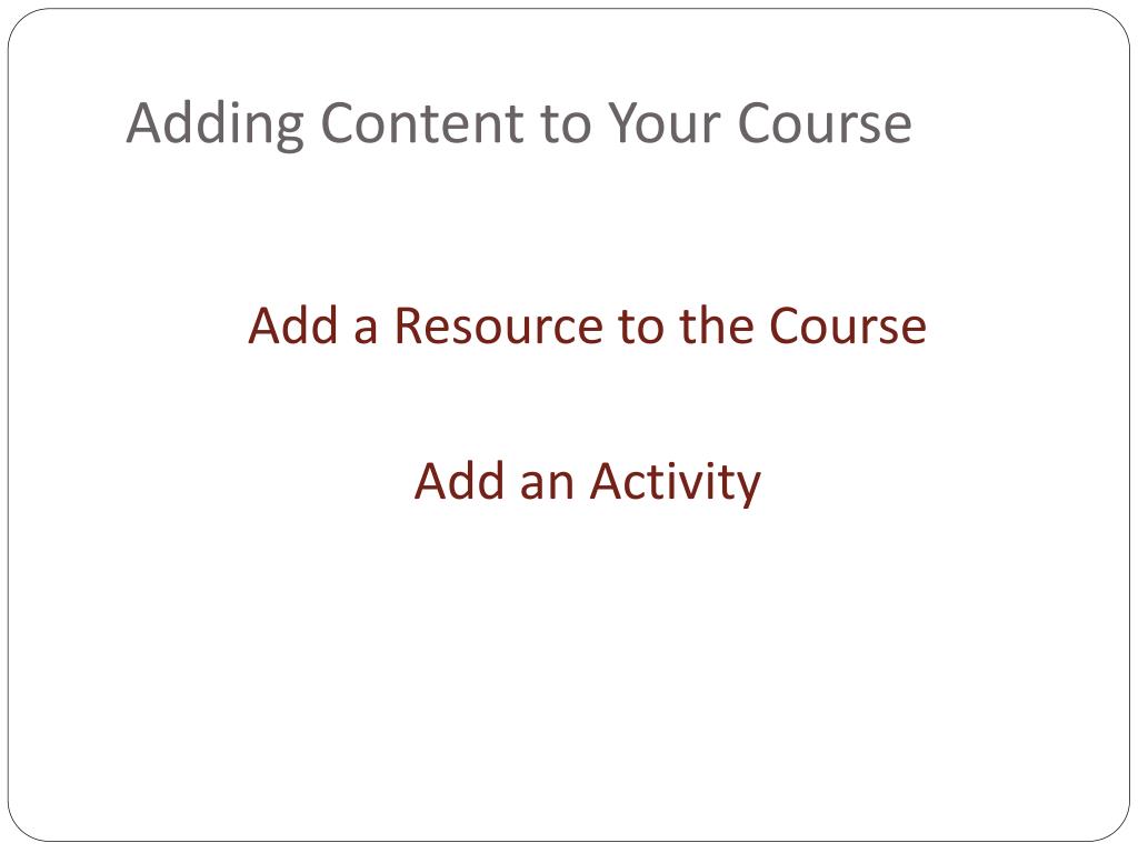 Adding Content to Your Course Add a Resource to the Course Add an Activity