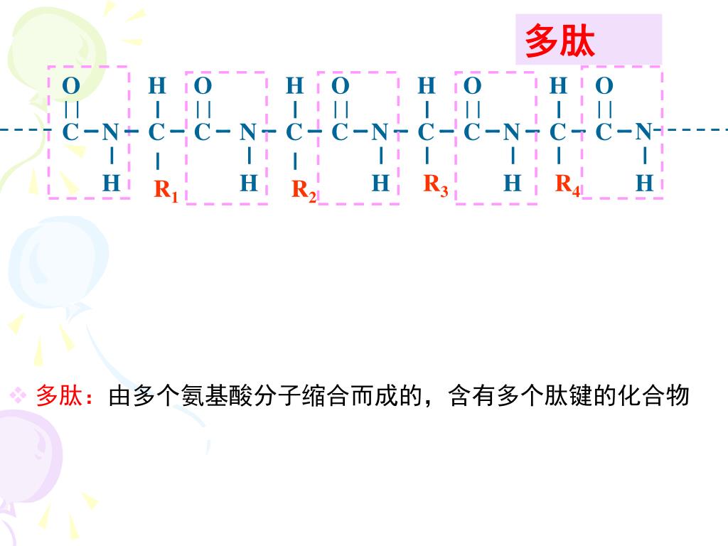 多肽 O H O H O H O H O C- N- C- C- N- C- C- N- C- C- N- C- C- N H H H R3 H R4 H R1 R2 • 多肽:由多个氨基酸分子缩合而成的,含有多个肽键的化合物