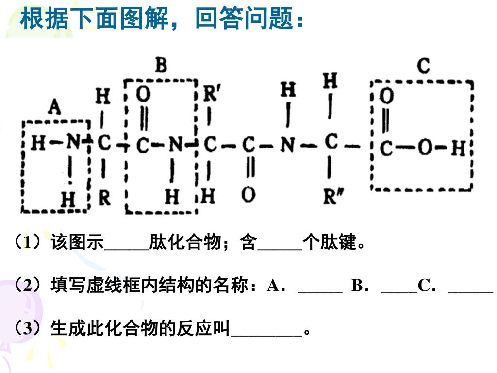 根据下面图解,回答问题: (1)该图示_____肽化合物;含_____个肽键。 (2)填写虚线框内结构的名称:A._____ B.____C._____ (3)生成此化合物的反应叫________。