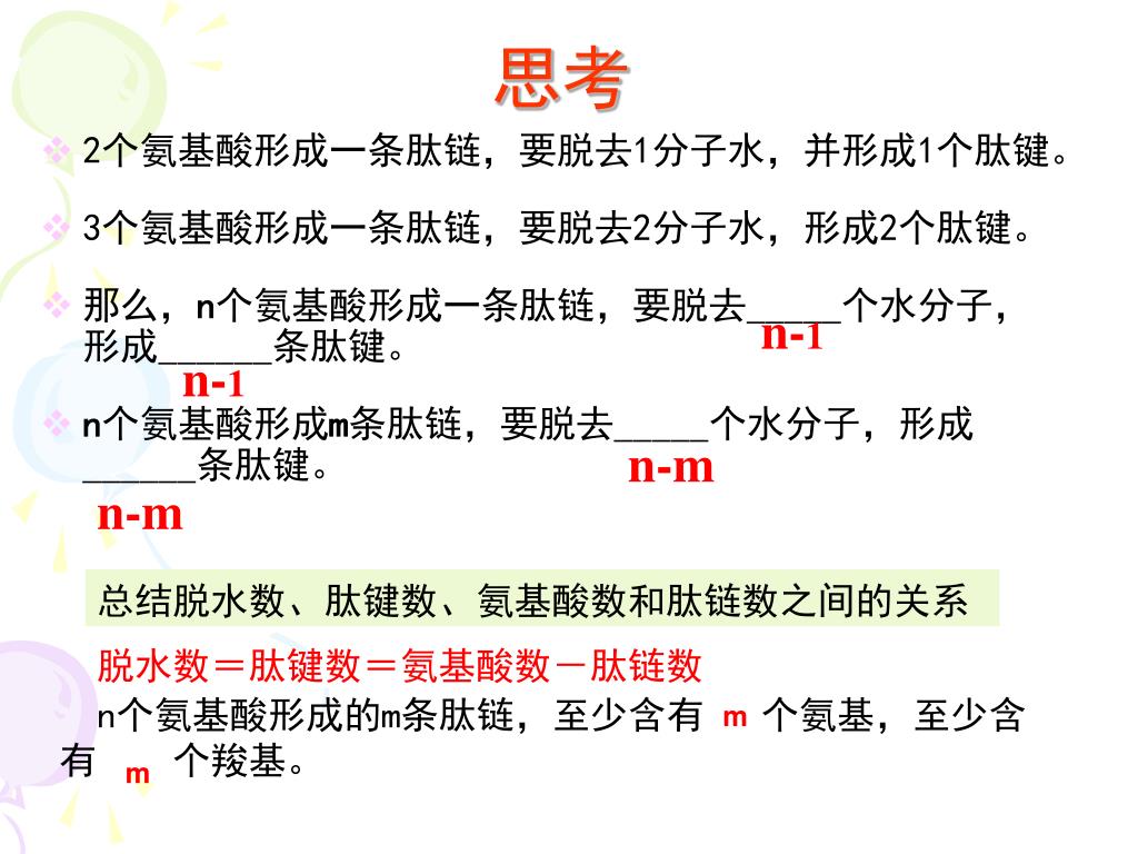 思考 • 2个氨基酸形成一条肽链,要脱去1分子水,并形成1个肽键。 • 3个氨基酸形成一条肽链,要脱去2分子水,形成2个肽键。 • 那么,n个氨基酸形成一条肽链,要脱去_____个水分子,形成______条肽键。 • n个氨基酸形成m条肽链,要脱去_____个水分子,形成______条肽键。 n-1 n-1 n-m n-m 总结脱水数、肽键数、氨基酸数和肽链数之间的关系 脱水数=肽键数=氨基酸数-肽链数 n个氨基酸形成的m条肽链,至少含有 个氨基,至少含 有 个羧基。 m m