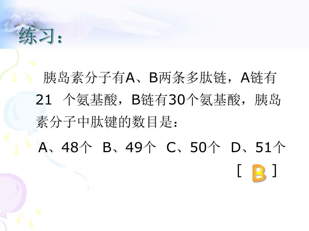 练习: 胰岛素分子有A、B两条多肽链,A链有21 个氨基酸,B链有30个氨基酸,胰岛素分子中肽键的数目是: A、48个 B、49个 C、50个 D、51个 [ ] B