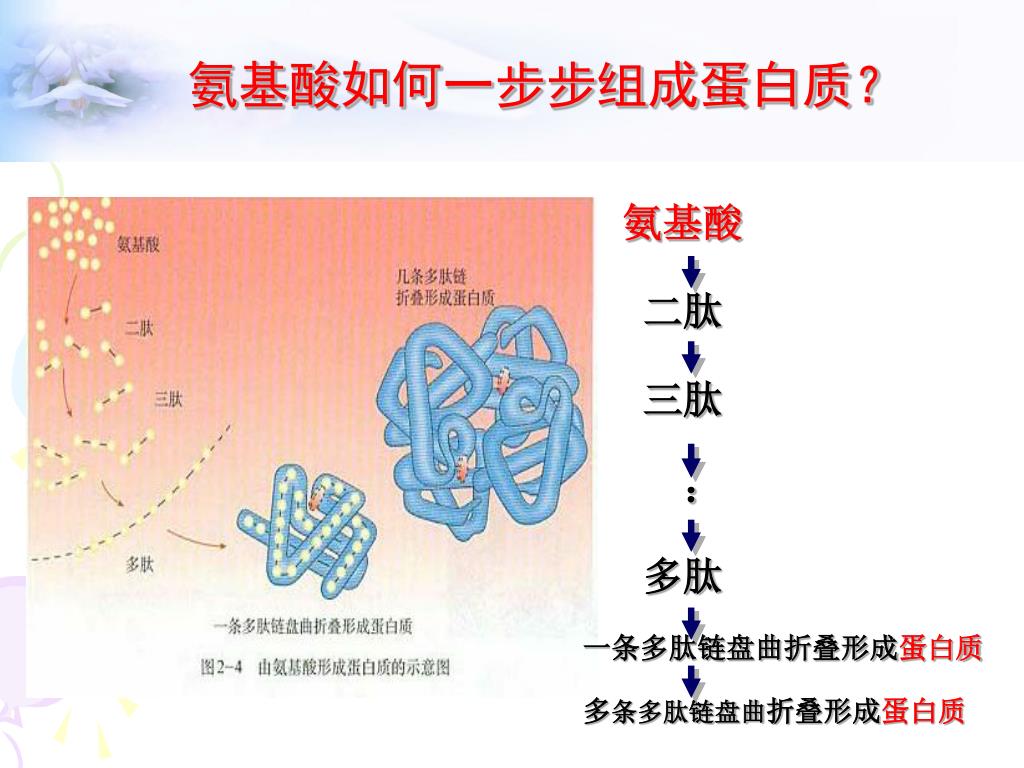 氨基酸如何一步步组成蛋白质? 氨基酸 二肽 三肽 : 多肽 一条多肽链盘曲折叠形成蛋白质 多条多肽链盘曲折叠形成蛋白质