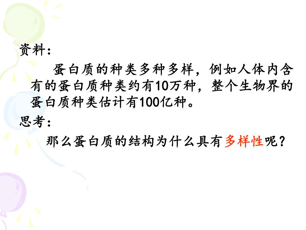 资料: 蛋白质的种类多种多样,例如人体内含有的蛋白质种类约有10万种,整个生物界的蛋白质种类估计有100亿种。 思考: 那么蛋白质的结构为什么具有多样性呢?
