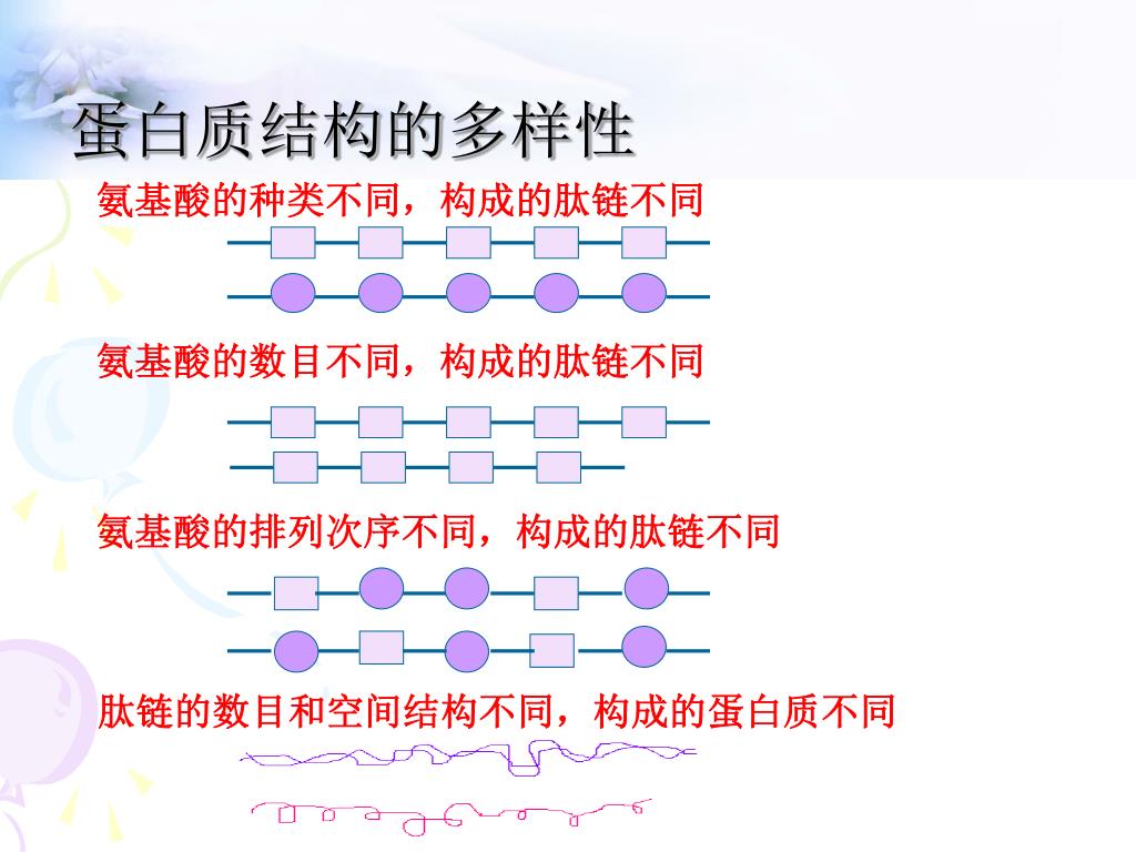 蛋白质结构的多样性 氨基酸的种类不同,构成的肽链不同 氨基酸的数目不同,构成的肽链不同 氨基酸的排列次序不同,构成的肽链不同 肽链的数目和空间结构不同,构成的蛋白质不同