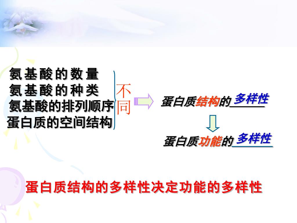 不同 蛋白质功能的_______ 氨基酸的数量 氨基酸的种类 多样性 蛋白质结构的______ 氨基酸的排列顺序 蛋白质的空间结构 多样性 蛋白质结构的多样性决定功能的多样性