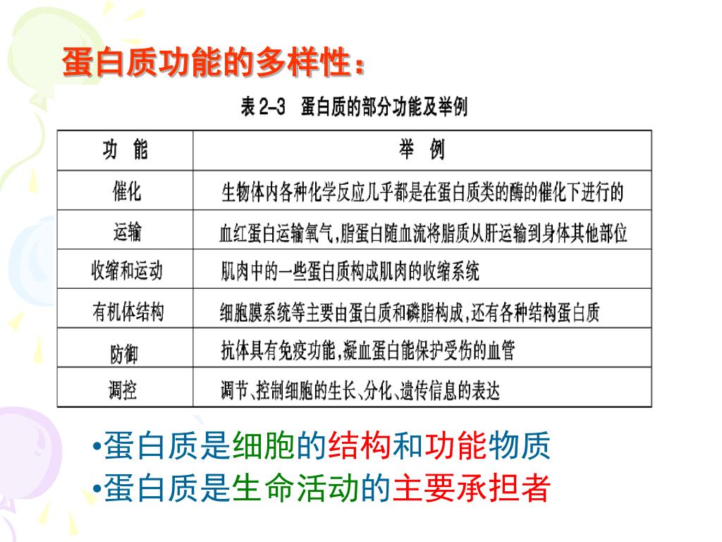 蛋白质功能的多样性: • 蛋白质是细胞的结构和功能物质 • 蛋白质是生命活动的主要承担者