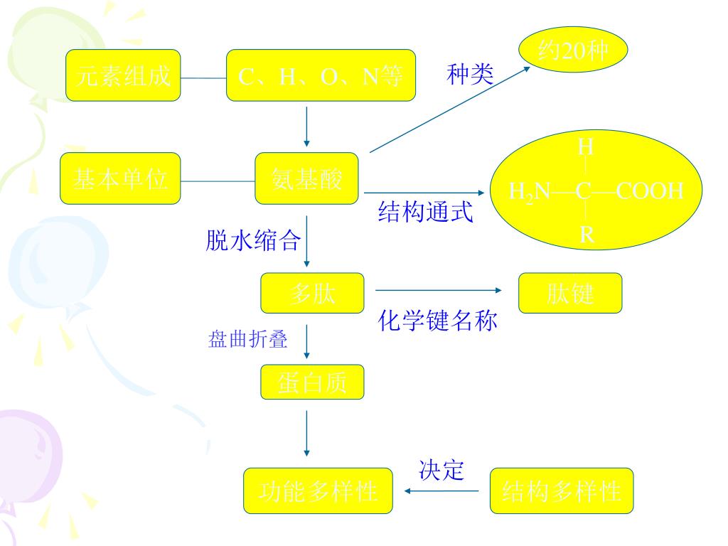 H2N—C—COOH H R 约20种 元素组成 C、H、O、N等 种类 基本单位 氨基酸 结构通式 脱水缩合 多肽 肽键 化学键名称 盘曲折叠 蛋白质 决定 功能多样性 结构多样性