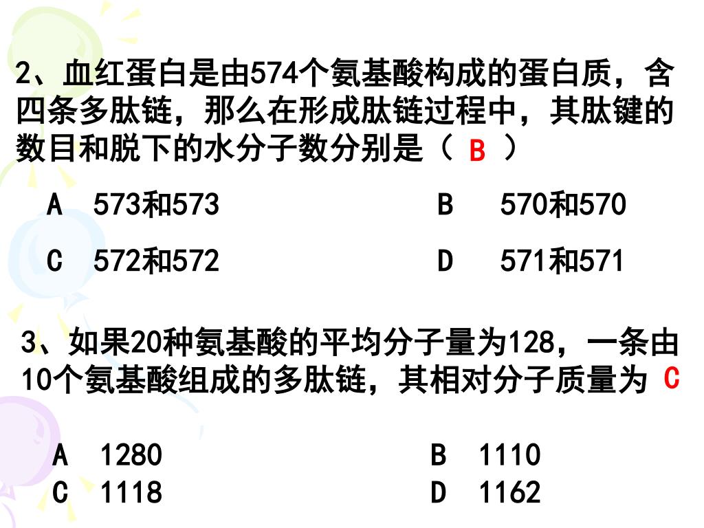 2、血红蛋白是由574个氨基酸构成的蛋白质,含四条多肽链,那么在形成肽链过程中,其肽键的数目和脱下的水分子数分别是( ) A573和573 B 570和570 C 572和572 D 571和571 B 3、如果20种氨基酸的平均分子量为128,一条由 10个氨基酸组成的多肽链,其相对分子质量为 A 1280 B 1110 C 1118 D 1162 C
