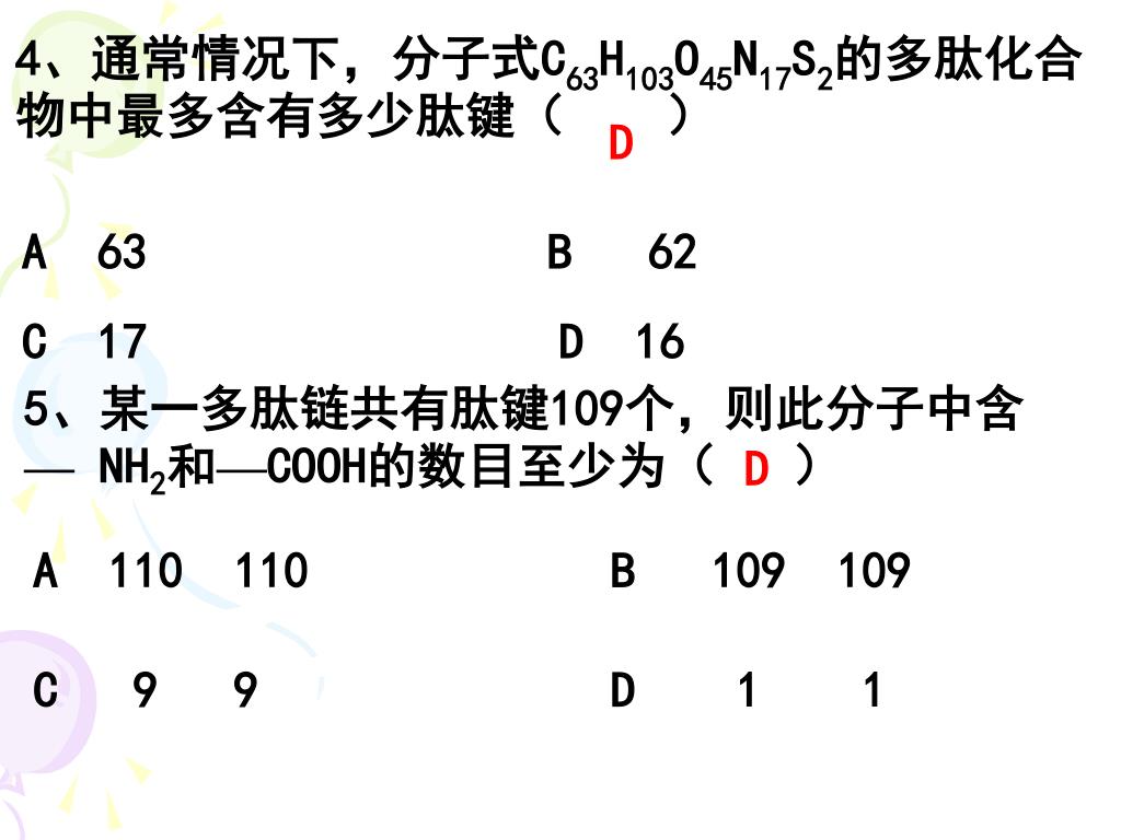 4、通常情况下,分子式C63H103O45N17S2的多肽化合4、通常情况下,分子式C63H103O45N17S2的多肽化合 物中最多含有多少肽键( ) A63 B 62 C 17D 16 D 5、某一多肽链共有肽键109个,则此分子中含 —NH2和—COOH的数目至少为( ) D A 110 110 B 109 109 C 9 9 D 1 1