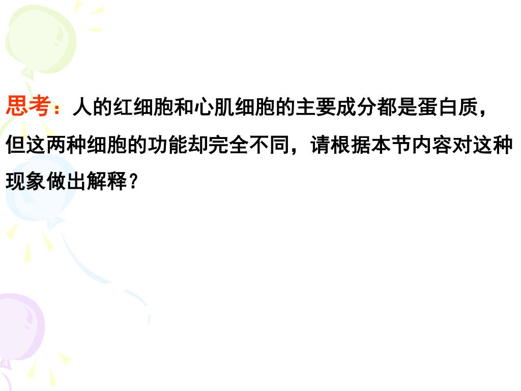 思考:人的红细胞和心肌细胞的主要成分都是蛋白质,但这两种细胞的功能却完全不同,请根据本节内容对这种现象做出解释? 思考:人的红细胞和心肌细胞的主要成分都是蛋白质,但这两种细胞的功能却完全不同,请根据本节内容对这种现象做出解释?