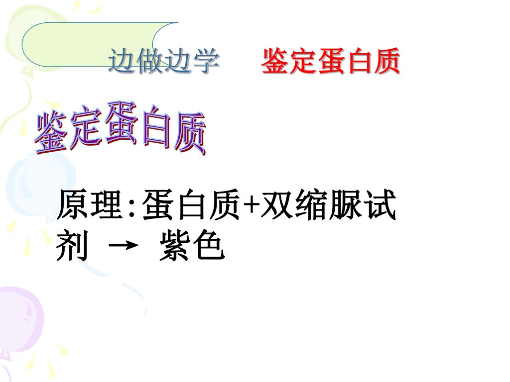 边做边学鉴定蛋白质 鉴定蛋白质 原理:蛋白质+双缩脲试剂 → 紫色