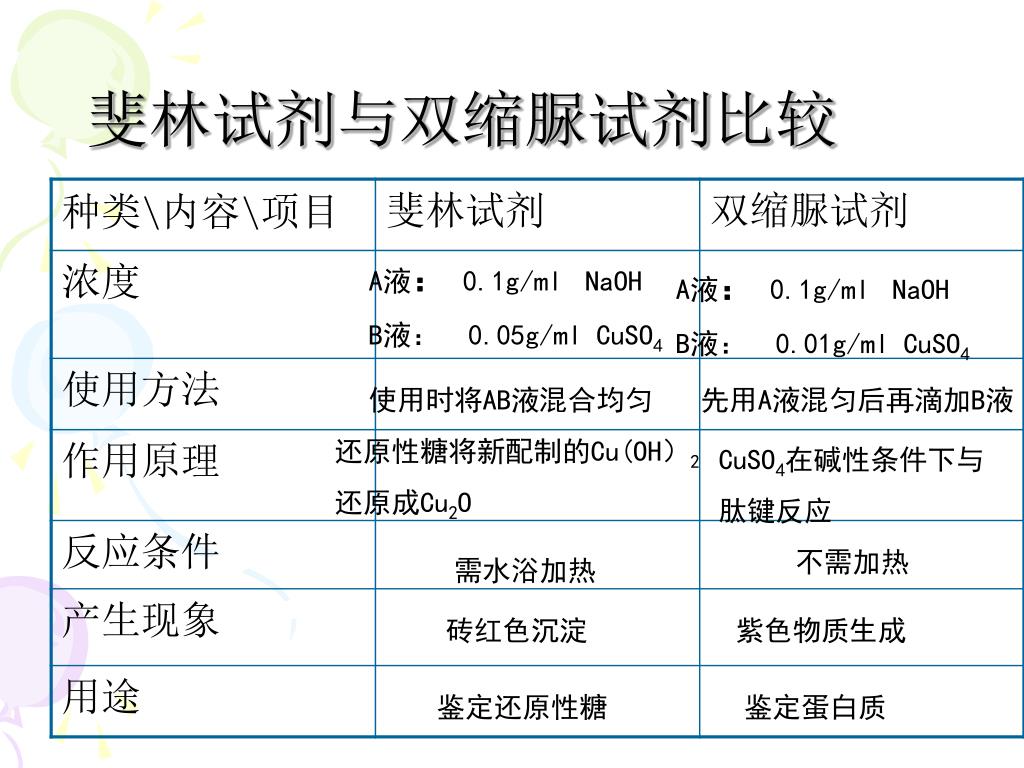 斐林试剂与双缩脲试剂比较 A液: 0.1g/mlNaOH B液: 0.05g/ml CuSO4 A液: 0.1g/mlNaOH B液: 0.01g/ml CuSO4 使用时将AB液混合均匀 先用A液混匀后再滴加B液 还原性糖将新配制的Cu(OH)2 还原成Cu2O CuSO4在碱性条件下与 肽键反应 不需加热 需水浴加热 砖红色沉淀 紫色物质生成 鉴定还原性糖 鉴定蛋白质