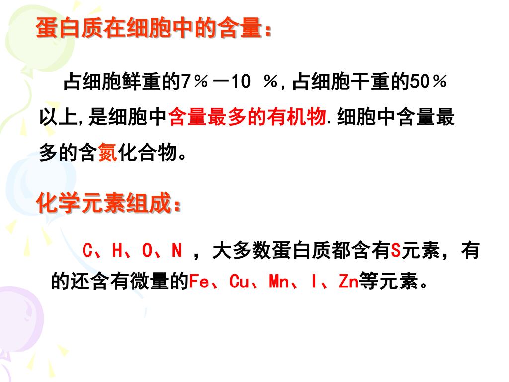 蛋白质在细胞中的含量: 占细胞鲜重的7﹪-10 ﹪,占细胞干重的50﹪以上,是细胞中含量最多的有机物.细胞中含量最多的含氮化合物。 化学元素组成: C、H、O、N,大多数蛋白质都含有S元素,有的还含有微量的Fe、Cu、Mn、I、Zn等元素。